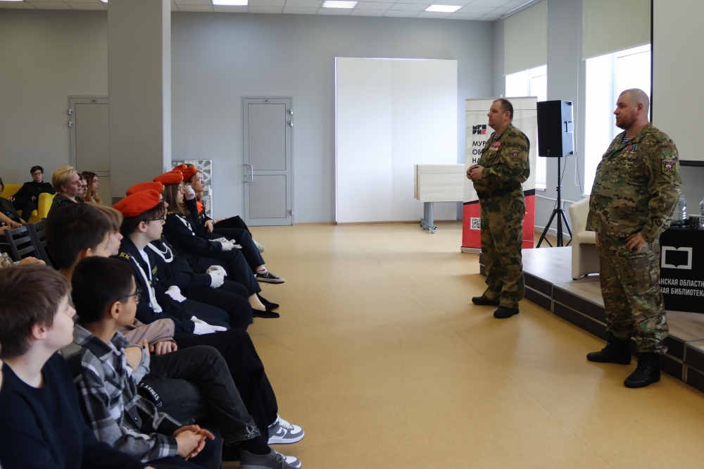 18 апреля в Мурманской областной научной библиотеки состоялось второе мероприятие из цикла «Среди СВОих» — «Беседа о важном в Научке». В гости в библиотеку пришли учащиеся Мурманского строительного колледжа, Мурманского международного лицея и 44 школы. Это мероприятие, организованное совместно со сторонниками партии «Единая Россия», стало частью масштабной акции «От героев прошлого к героям настоящего», приуроченной к Году Защитника Отечества. Тема встречи была посвящена современному героизму, рассматривая его не только сквозь исторические события, но и через призму специальной военной операции.
