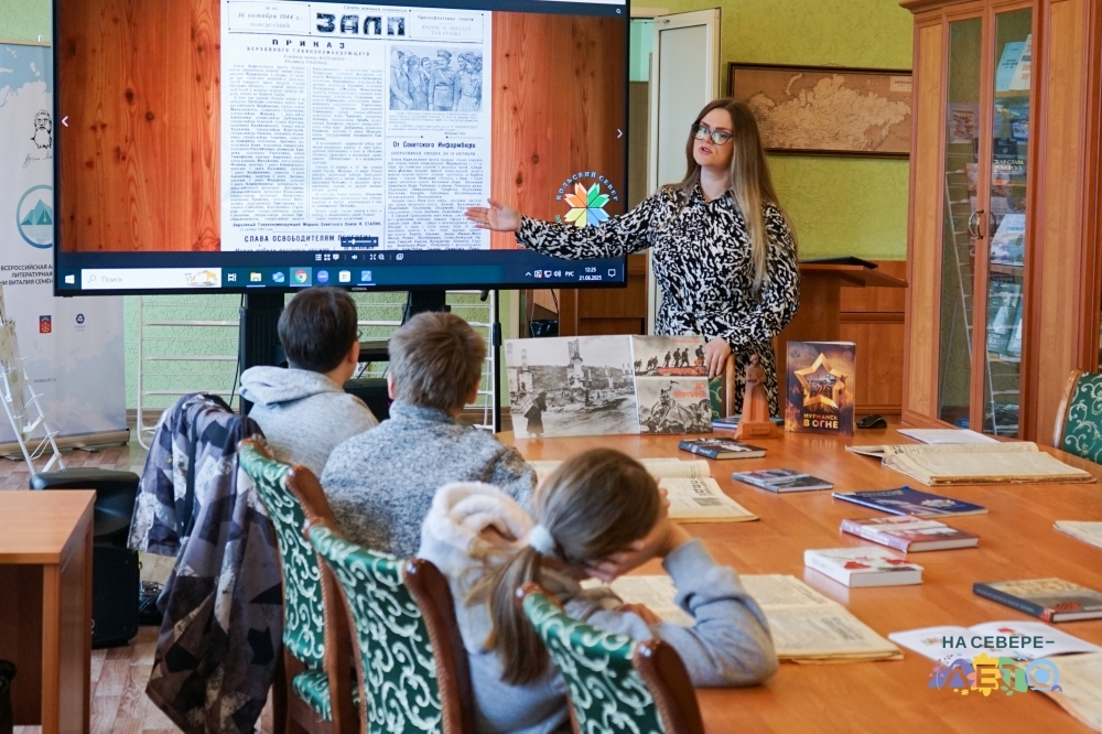 Школьники с особым интересом прослушали лекцию «Петсамо-Киркенесская наступательная операция». Лектор – Токарева Анна Сергеевна, главный библиотекарь отдела краеведения Мурманской областной научной библиотеки – рассказала о ходе боевых действий, расстановке сил и расположением линии фронта во время проведения операции с 7 по 29 октября 1944 года. Лекция сопровождалась демонстрацией военных карт, фотографий, наградных листов, а также фильма «Оборона Заполярья», подготовленного сотрудниками отдела краеведения Мурманской областной научной библиотеки.