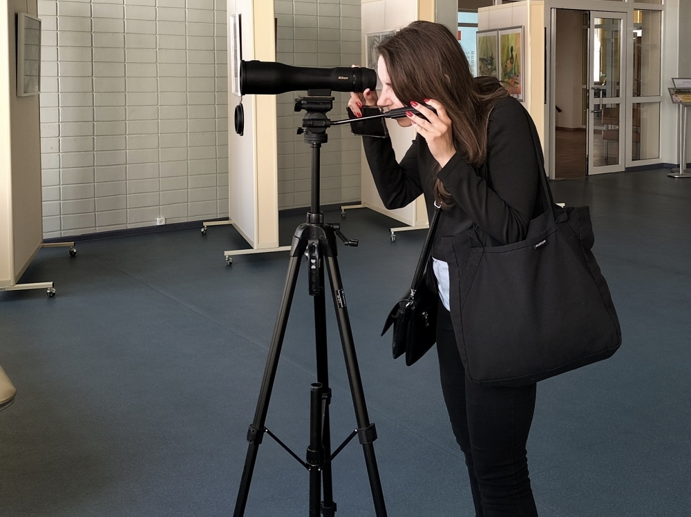 В завершении экскурсии ее участники увлеченно рассматривали здания и памятники в подзорную трубу с высоты четвертого этажа библиотеки.