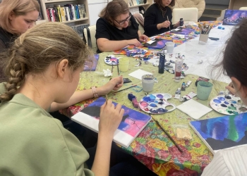 4 октября на мастер-классе «Над горами севера» в зале искусств собрались любители рисования акрилом. Прохладный вечер идеально подошёл для создания необычной работы на холсте.