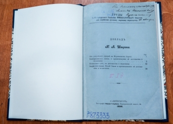 Одна из отреставрированных книг, включающая текст доклада Н. А. Шаврова об устройстве гаваней на Мурмане, ранее хранилась в библиотеке военного министра, историка, члена Русского географического общества Алексея Николаевича Куропаткина (1848–1925). На обложке нашего экземпляра имеются штемпель «Библiотека А. Н. Куропаткина» и дарственная надпись «Его высокопревосходительству Алексею Николаевичу Куропаткину от автора».