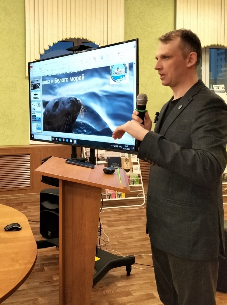 15 ноября в Мурманской областной научной библиотеке состоялась лекция заведующего лабораторией морских млекопитающих Мурманского морского биологического института РАН Александра Зайцева «Морские млекопитающие Баренцева и Белого морей».