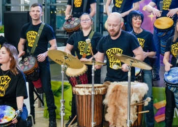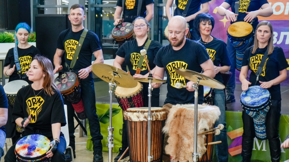 Особое праздничное настроение создала зажигательная музыка перкуссионного оркестра DrumTamTam. Барабанщики зарядили атмосферу энергией ритма и бодрости.