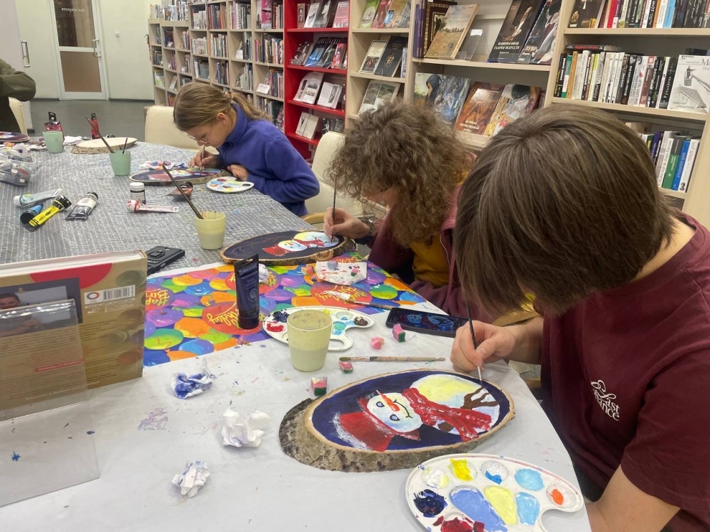 6 декабря 2025 года на мастер-классе «Снеговичок» в зале искусств собрались любители рисования акрилом. Прохладный вечер идеально подошёл для создания необычной работы на спиле натурального дерева.