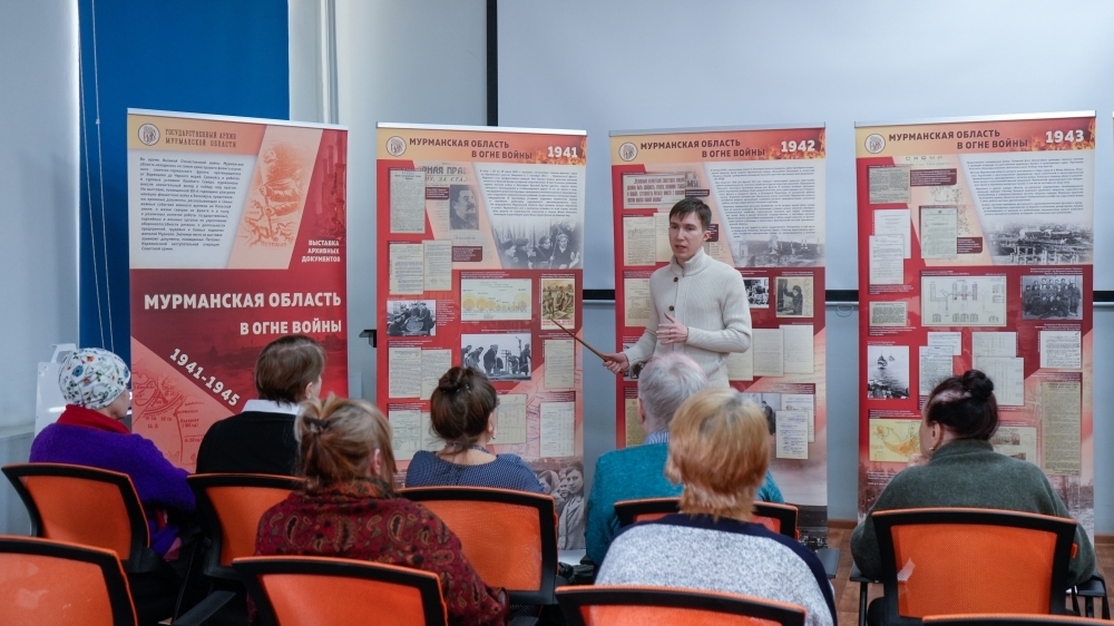 17 февраля 2026 года сотрудники Государственного архива Мурманской области представили участникам клуба «Старшие» передвижную выставку «Мурманская область в огне войны. 1941–1945 гг.» Экспозиция в виде шести ролл-апов, каждый из которых рассказывает о событиях войны за Полярным кругом, посвящена 80-й годовщине разгрома немецко-фашистских войск в Заполярье. Присутствующие увидели архивные документы о самых важных событиях военного времени на Кольской земле, о жизни северян на фронте и в тылу, о деятельности предприятий, партийных и военных органов по укреплению обороноспособности региона, о трудовых и боевых подвигах жителей Мурмана. Значимое место на выставке занимают документы, посвященные Петсамо-Киркенесской наступательной операции Советской армии. Выставка сопровождалась лекцией специалиста-экскурсовода Михаила Жидкова.