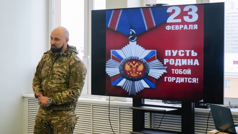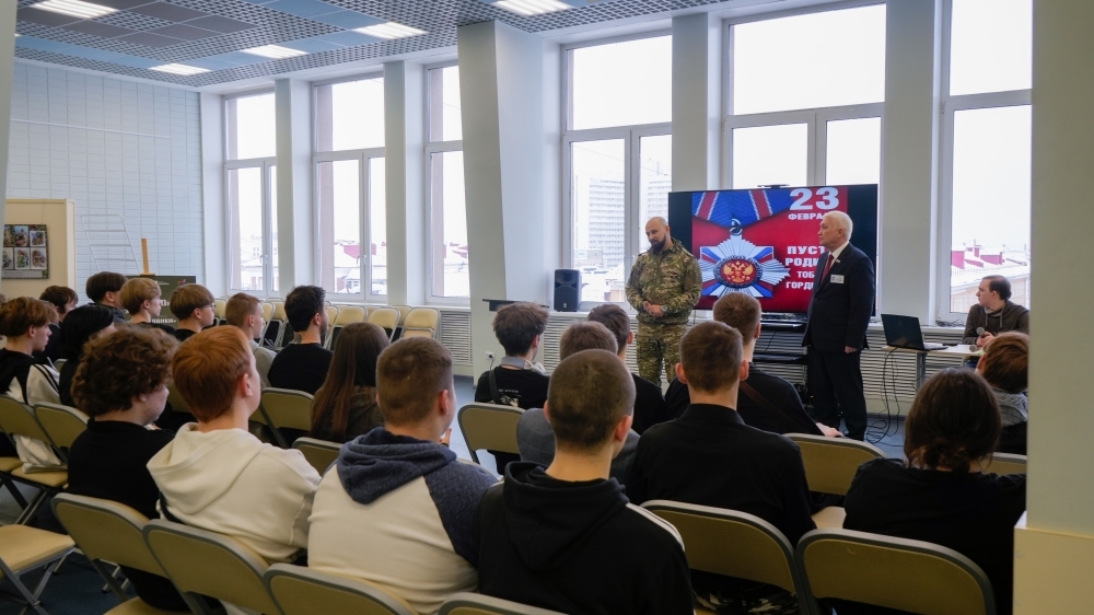 Лекцию-дискуссию «Служение Отечеству: из поколения в поколение» провел Алексей Чуфырёв – победитель конкурса «Знание. Лектор – 2025», учитель гимназии № 1 из Апатитов. Он рассказал об истории праздника 23 февраля, о выдающихся полководцах России и подвигах героев, включая Николая Гастелло и Александра Матросова, а также отметил роль тыла и инженерной мысли в Великой Отечественной войне.
