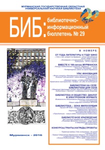 библиотечно- информационный бюллетень № 29 БИБ: МУРМАНСКАЯ ГОСУДАРСТВЕННАЯ ОБЛАСТНАЯ УНИВЕРСАЛЬНАЯ НАУЧНАЯ БИБЛИОТЕКА Мурманск - 2016 В Н О М Е Р Е: ОТ ГОДА ЛИТЕРАТУРЫ К ГОДУ КИНО - «Что и как читают на Мурмане»: итоги исследования - Акция «Идем в кино!» - «Киномания» в Снежногорске: скучать некогда! - Библионочь - 2016 в «научке» ВМЕСТЕ К 100-летию МУРМАНСКА - Конкурс библиотечных проектов «Мурманск – столица Кольского Заполярья» - анонс - Литературные имена на карте Мурманска УРА! ИННОВАЦИЯ - Итоги конкурса «Инновационный библиотечный проект» -Книжный чудо-рюкзачок: новые форматы продвижения книги и чтения -«Базовый лагерь» в библиотеке Мурманска -Креативное пространство «Тундра»: от идеи до воплощения БИБЛИОТЕКИ НА СЕЛЕ. БИБЛИОТЕКИ ДЛЯ СЕЛА - Областной фестиваль-конкурс сельских библиотек в Умбе - Библиотека п. Высокий в информационном обществе БИБЛИОТЕКА И ОБЩЕСТВО: ДИАЛОГ В ЭЛЕКТРОННОМ ФОРМАТЕ -Возможности обслуживания удаленных пользователей в on-line пространстве -Новые цифровые коллекции МГОУНБ БИБЛИОТЕКА – ЗОНА МИЛОСЕРДИЯ -Проект МГОСБС «Ограниченные возможности – безграничный потенциал» -Творческая лаборатория «Доступное пространство библиотеки» -«Преодоление» - новый отдел снежногорской библиотеки БИБЛИОТЕЧНОЕ КРАЕВЕДЕНИЕ -Дни культуры Мурманской области в Москве -«Писатели флотской столицы» - новый музей в североморской библиотеке -450-летие Колы КОНКУРСЫ,ГРАНТЫ,НАГРАДЫ,ПРОЕКТЫ - Памятная медаль Года литературы «За вклад в книжное дело» - Премия Губернатора Мурманской области «За сохранение и развитие культуры в Мурманской области -«Лучший библиотекарь – 2015» среди североморских библиотекарей