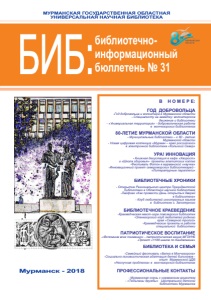 библиотечно- информационный бюллетень № 31 БИБ: МУРМАНСКАЯ ГОСУДАРСТВЕННАЯ ОБЛАСТНАЯ УНИВЕРСАЛЬНАЯ НАУЧНАЯ БИБЛИОТЕКА Мурманск - 2018 В Н О М Е Р Е: ГОД ДОБРОВОЛЬЦА -Год добровольца и волонтера в Мурманской области - Специалисту на заметку: волонтерское движение и библиотеки - «Универсальная территория» - добровольческая работа в мончегорских библиотеках 80-ЛЕТИЕ МУРМАНСКОЙ ОБЛАСТИ - Муниципальные библиотеки – к 80 - летию Мурманской области - Новая цифровая коллекция «Мурман – край российский» в электронной библиотеке «Кольский Север» УРА! ИННОВАЦИЯ - Книжная дегустация в кафе «Хворост» и «Школа здоровья»- проекты апатитских коллег -Фестиваль Фотон в мурманской «научке» -Инновационный проект североморских библиотекарей - «Литературные параллели» БИБЛИОТЕЧНЫЕ ХРОНИКИ - Открытие Регионального центра Президентской библиотеки в Областной научной библиотеке -Лайфхак «Как провести День открытых дверей в библиотеке» - Клуб любителей иностранных языков в библиотеке г. Заполярного БИБЛИОТЕЧНОЕ КРАЕВЕДЕНИЕ -Краеведческая квест-игра ловозерских библиотек -Оленегорский клуб любителей родного края «Северной тропой» -Краеведческие проекты в работе специальной библиотеки ПАТРИОТИЧЕСКОЕ ВОСПИТАНИЕ -«Вспомним всех поименно» - патриотическая акция МГОУНБ -Проект «1188 шагов по Кандалакше» БИБЛИОТЕКА И СЕМЬЯ -Семейный фестиваль «Белка в Мончегорске» -Социально-лингвистическая адаптация детей билингвов - опыт Мурманской ЦДБ «Нескучная продленка» в мончегорских библиотеках ПРОФЕССИОНАЛЬНЫЕ КОНТАКТЫ - Мурманская осень с норвежским акцентом - «Тюльпаны дружбы» Центральной детской библиотеки Мурманска