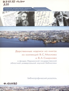 Дарственные надписи на книгах из коллекций В. С. Маслова и В. А. Смирнова в фондах Мурманской государственной областной универсальной научной библиотеки : библиографический указатель / Мурм. гос. обл. универс. науч. б-ка ; [сост. Т. П. Леонтьева ; редкол.: Е. В. Синева и др. ; предисл. В. Сорокажердьева]. – Мурманск : РУСМА (ИП Глухов А. Б.), 2011. – 110, [1] с., [8] с. ил. : ил., портр., факс. – (Серия "Книжные коллекции").