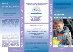 Ребенок идет в школу : [рекомендательный список] / Мурм. гос. обл. универс. науч. б-ка ; [ сост. Передерий Т. М.]. – Мурманск : Мурманская государственная областная универсальная научная библиотека, 2011. – 1 обертка ([4] отд. л.) : ил. – (Родители, будьте бдительны! : серия рекомендательных списков литературы ; вып. 4). Вып. осуществлен в рамках долгосрочной целевой программы "Поддержка семьи в Мурманской области. 2009-2011 гг.".