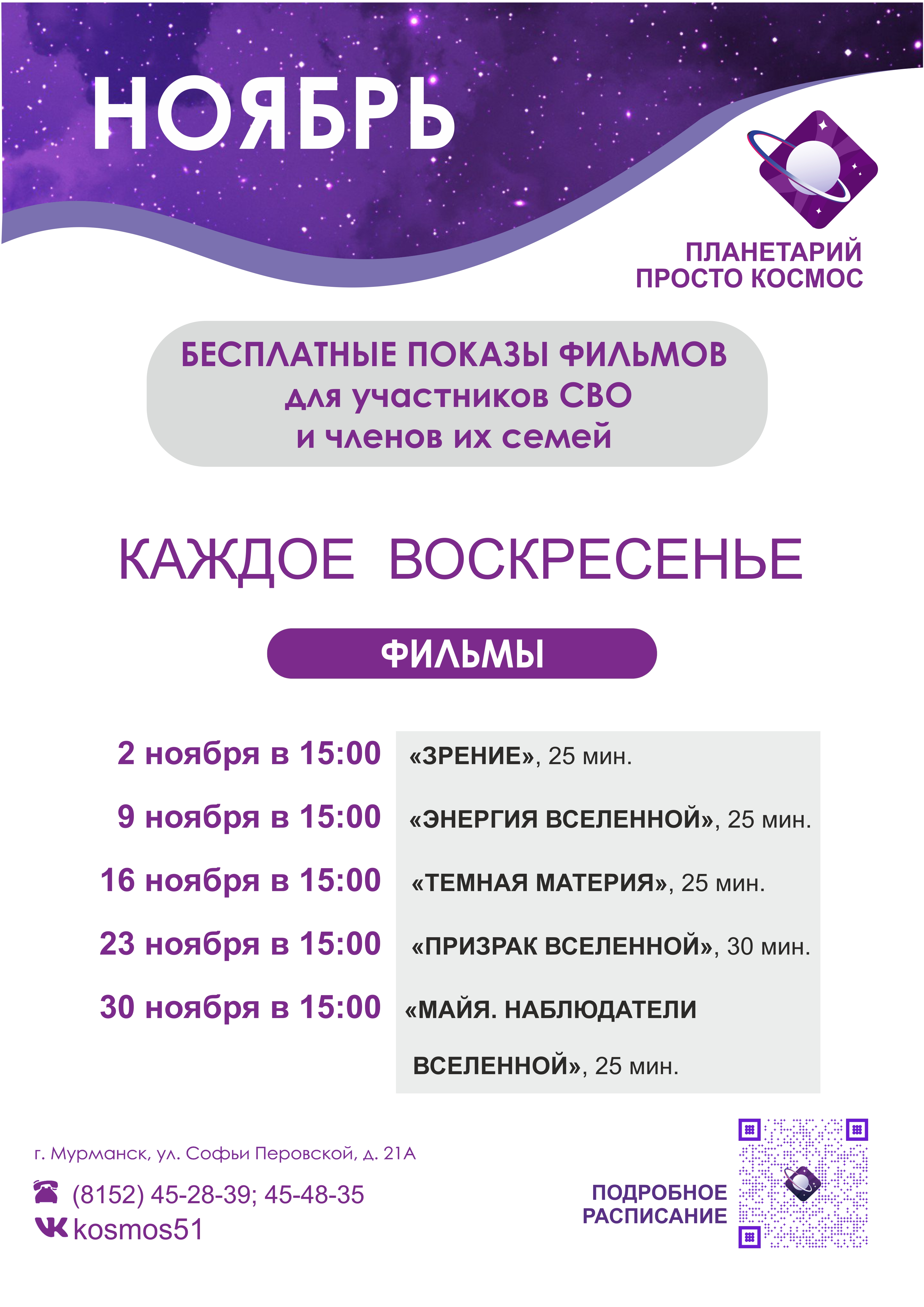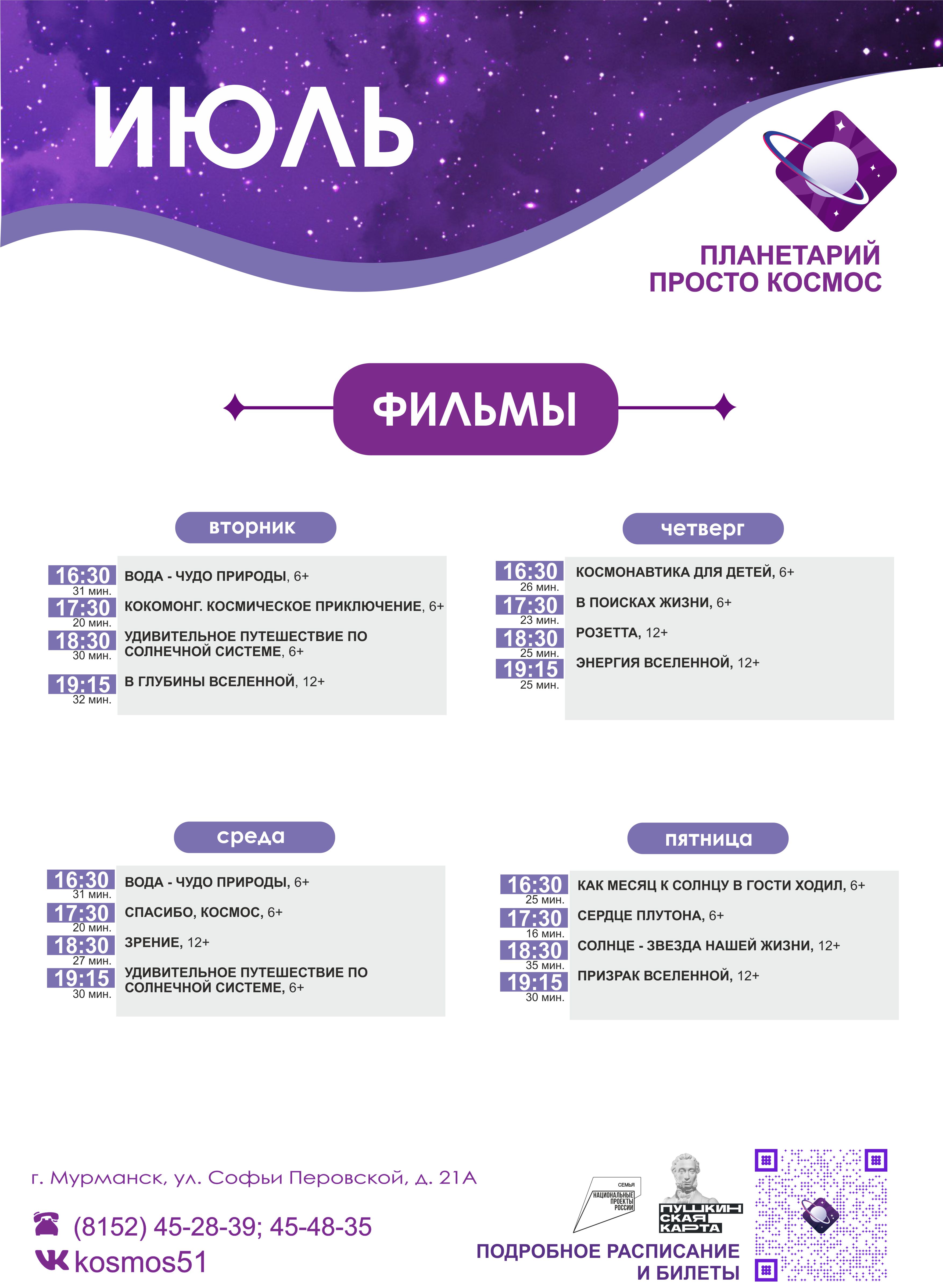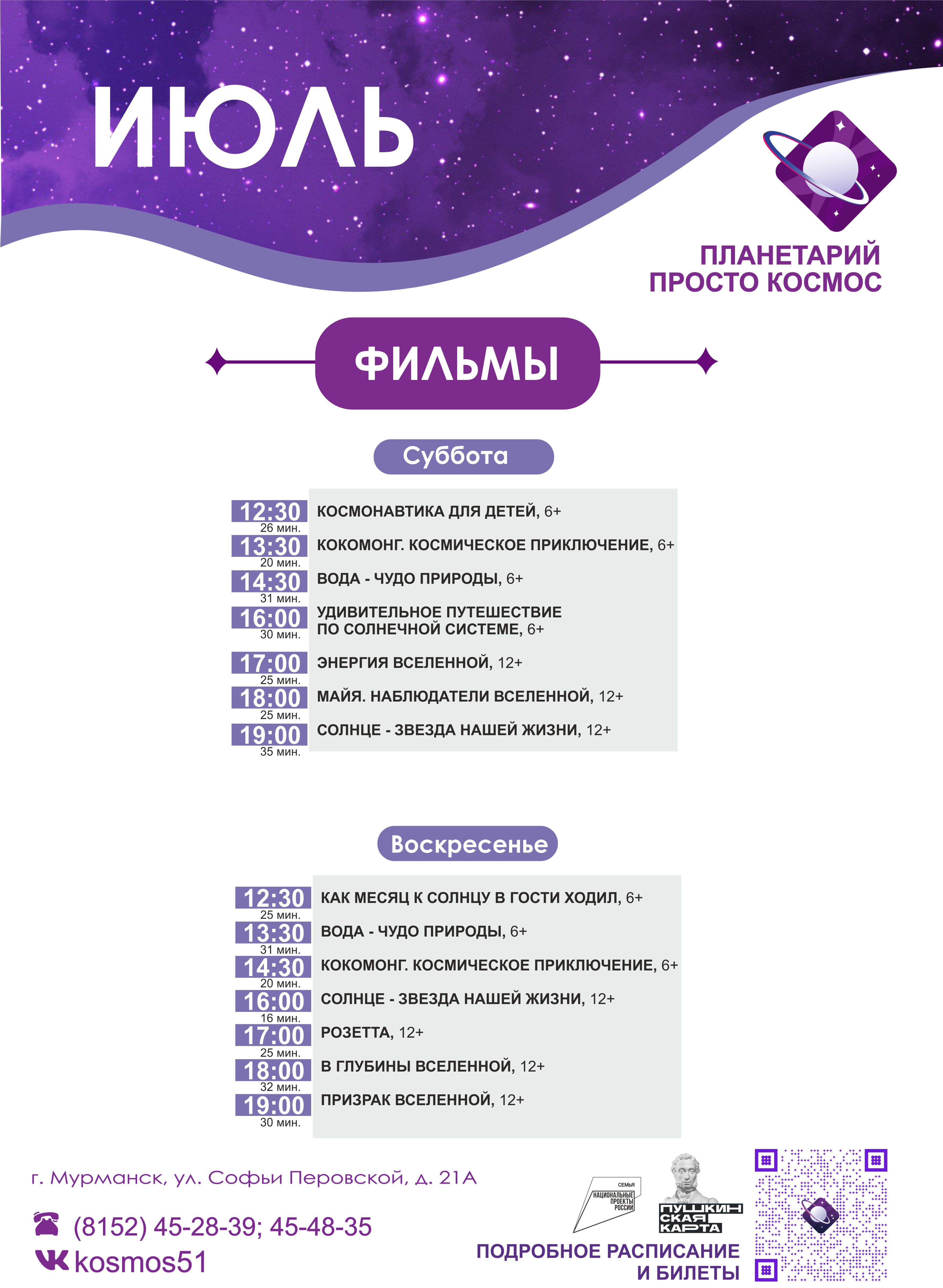 - постоянно пополняющаяся библиотека ярких фильмов в специальном формате FullDome, гарантирующем эффект полного погружения зрителей в повествуемые события (продолжительность фильмов от 35 до 50 минут);
