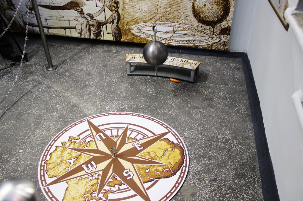 Мурманский маятник является самым большим за Полярным кругом. Самое интересное, что у нас отклонение колебаний хотя бы будет заметно, а вот на экваторе запустить такой маятник не получится, так как плоскость останется неподвижной. Вместе со всеми крепежами мурманский маятник Фуко весит 32 кг с длиной подвеса из кевлара 21 м. Очень важно при запуске погасить любое колебание нити и маятника.
